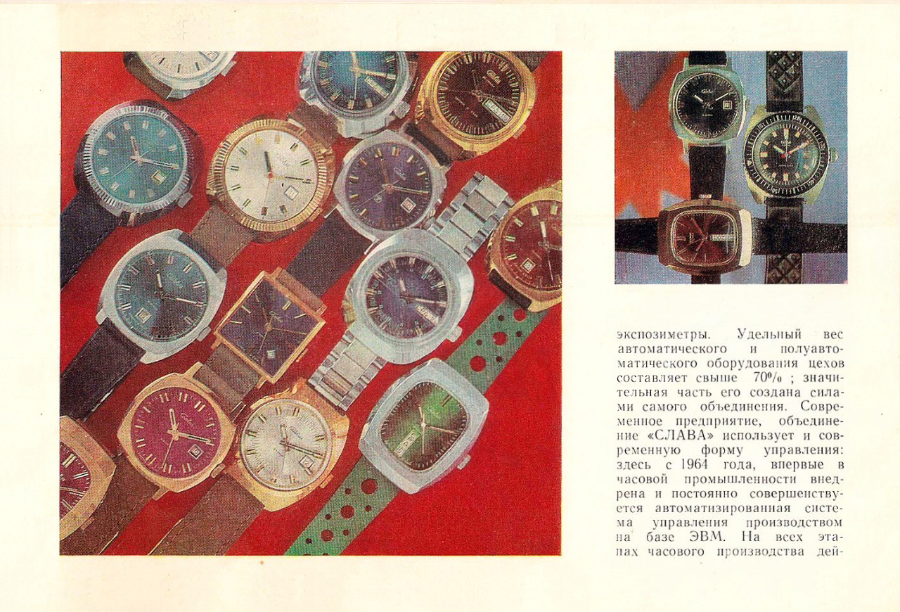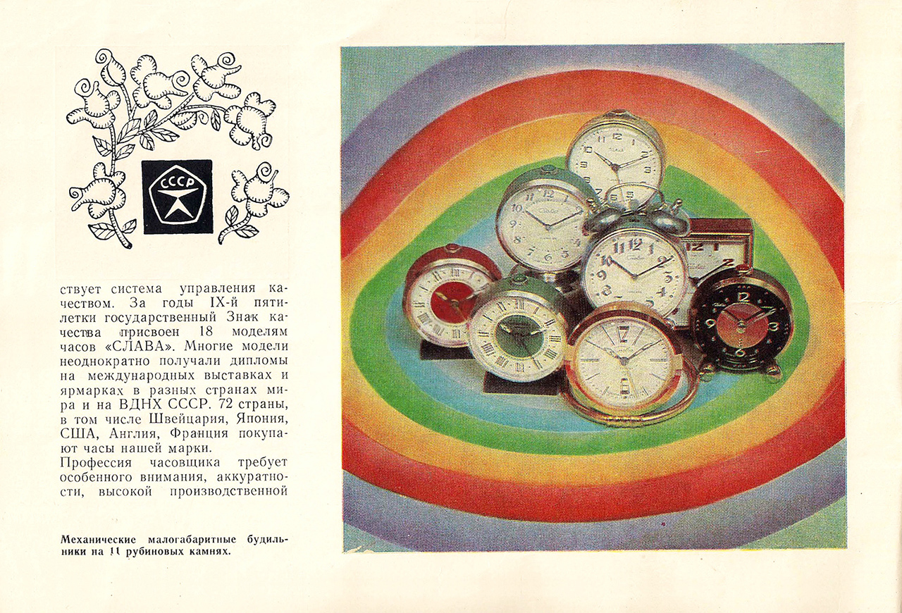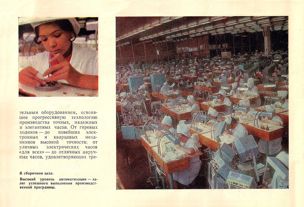 От гиревых ходиков - до новейших электронных и кварцевых механизмов высокой точности; от уличных элекктрических часов «для всех» - до отличных наручных часов, удовлетворяющих требованиям современного потребителя, - таков путь предприятия, знаменующий мощное развитие советской часовой промышленности.