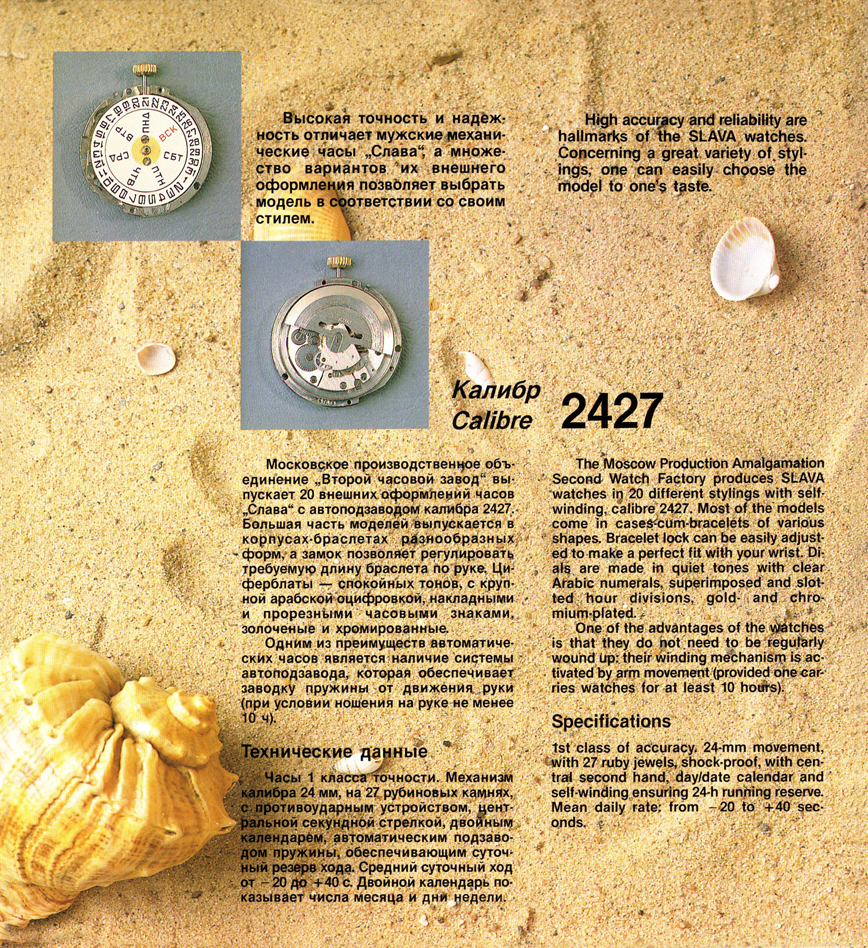 Калибр 2427. Московское производственное объединение «Второй часовой завод» выпускает 20 внешних оформлений часов «Слава» с автоподзаводом калибра 2427. Большая часть моделей выпускается в корпусах-браслетах разнообразных – форм, а замок позволяет регулировать требуемую длину браслета по руке. Циферблаты — спокойных тонов, с крупной арабской оцифровкой, накладными и прорезными часовыми знаками, золоченые и хромированные.