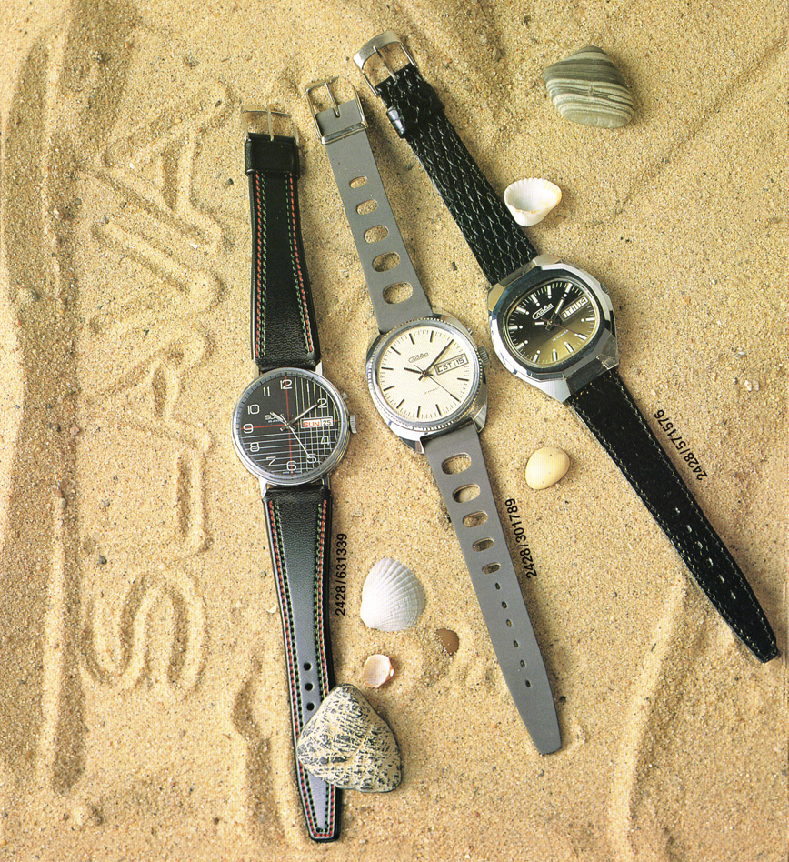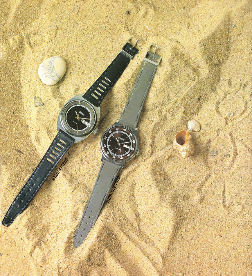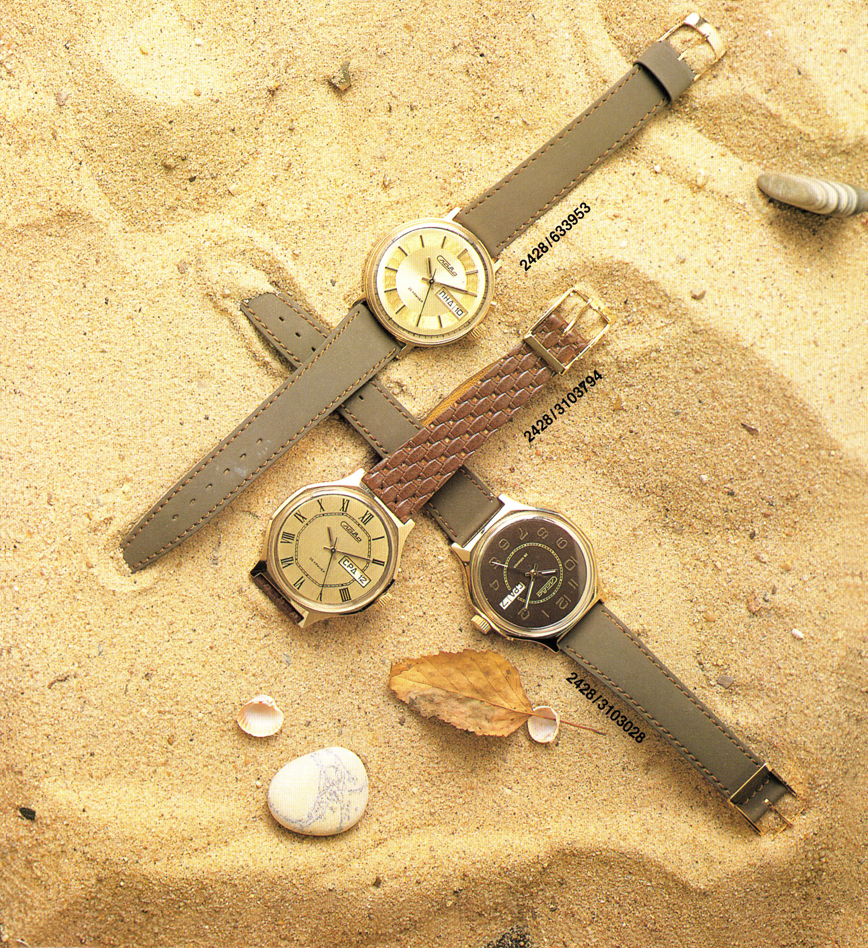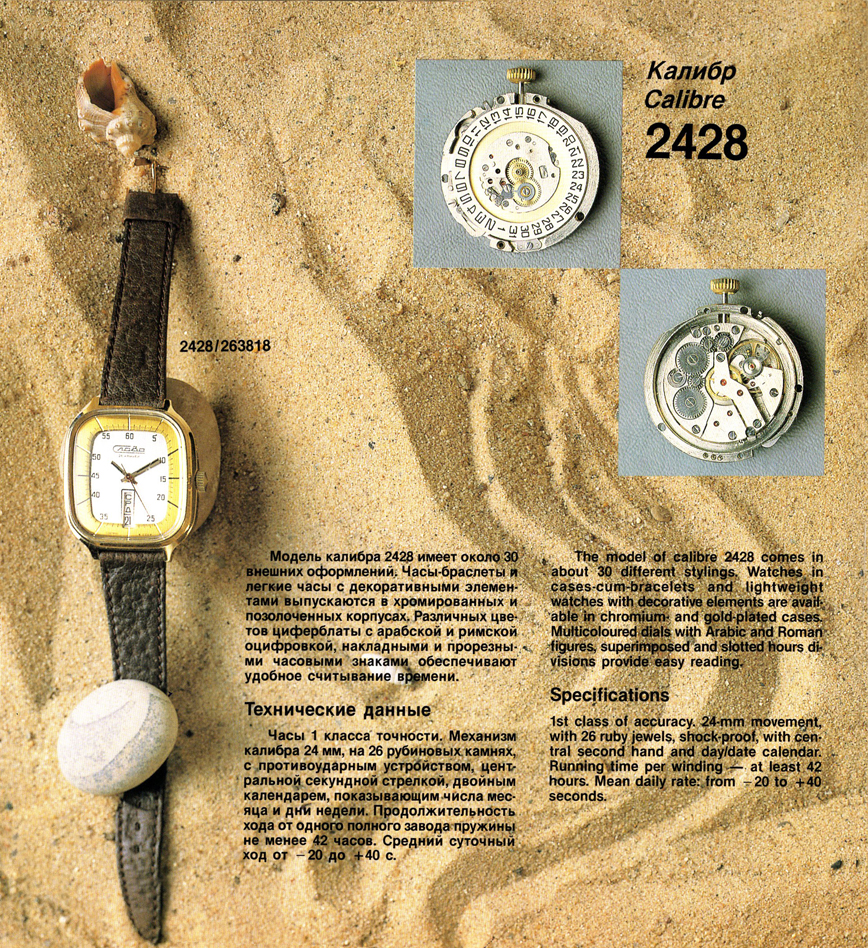 Калибр 2428. Модель калибра 2428 имеет около 30 внешних оформлений. Часы-браслеты и легкие часы с декоративными элементами выпускаются в хромированных и позолоченных корпусах. Различных цветов циферблаты с арабской и римской оцифровкой, накладными и прорезными часовыми знаками обеспечивают удобное считывание времени.