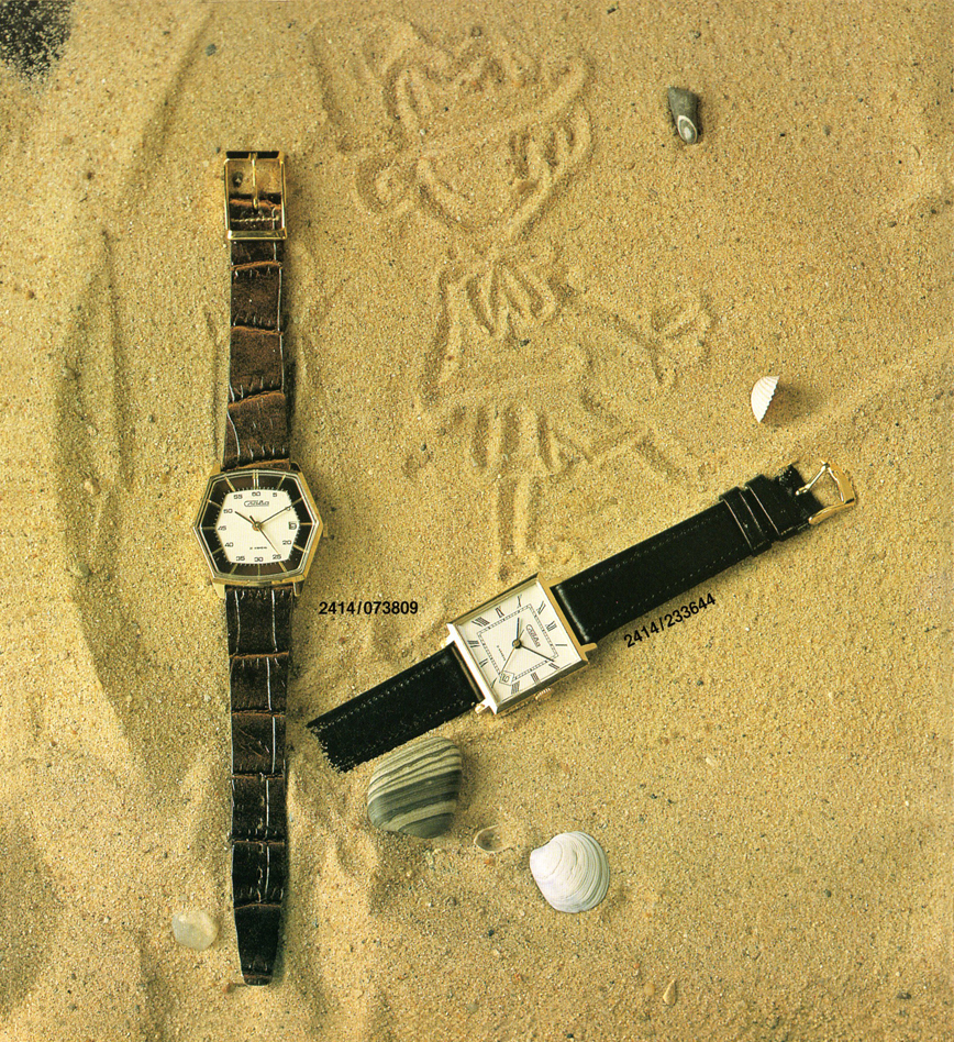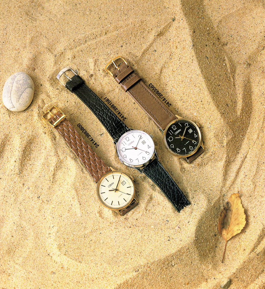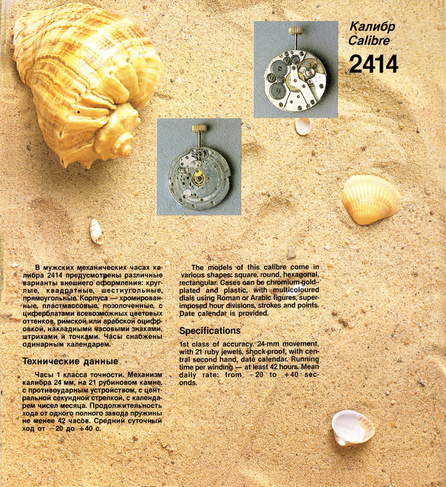 Калибр 2414. В мужских механических часах калибра 2414 предусмотрены различные варианты внешнего оформления: круглые, квадратные, шестиугольные, прямоугольный Корпуса — хромированные, пластмассовые, позолоченные, с циферблатами всевозможных цветовых оттенков, римской или арабской оцифровкой, накладными часовыми знаками, штрихами и точками. Часы снабжены одинарным календарем.